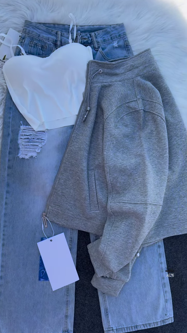 Paired with light blue distressed denim jeans, the set strikes a balance between rugged and refined. The jeans feature a single distressed patch on the left thigh—just enough edge to keep things interesting without overpowering the look. The fit is relaxed yet flattering, ideal for casual wear, boutique styling, or creative shoots. Branding near the hem (“Black X” and “AFS”) adds a streetwear signature, making the piece feel curated and collectible.
