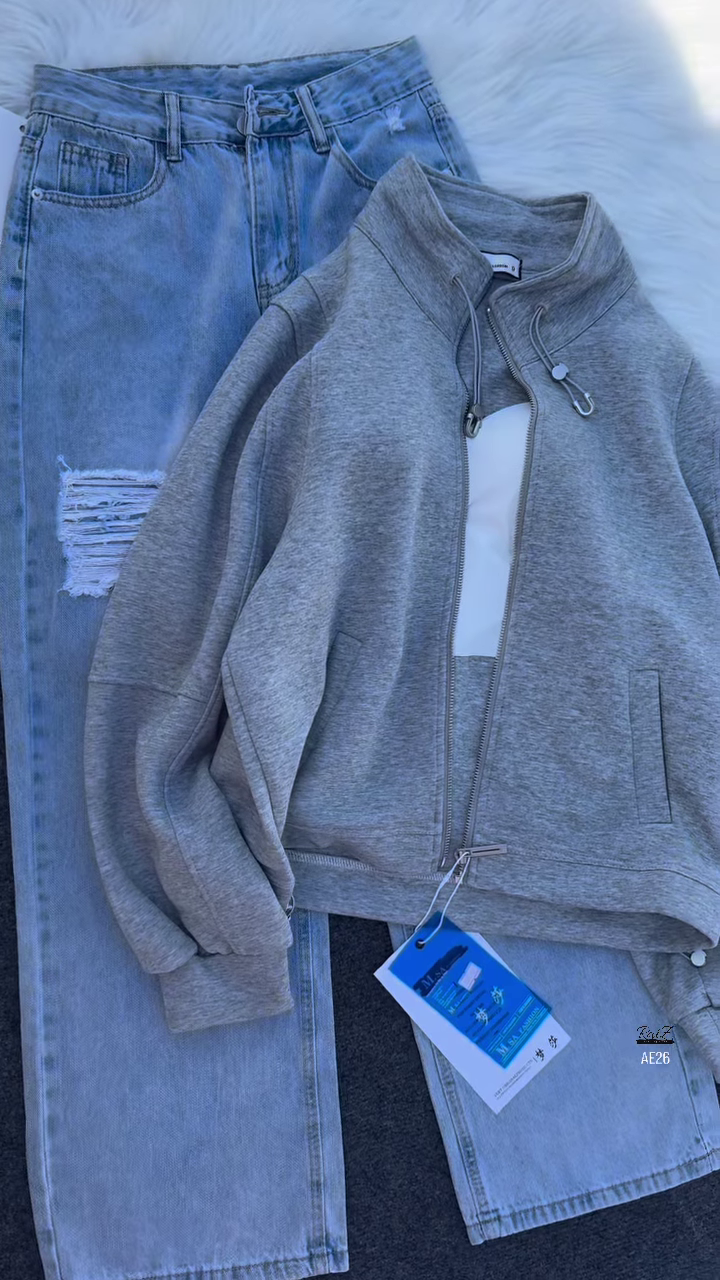 🧥 Urban Ember: Maroon Zip Jacket & Distressed Denim Set
