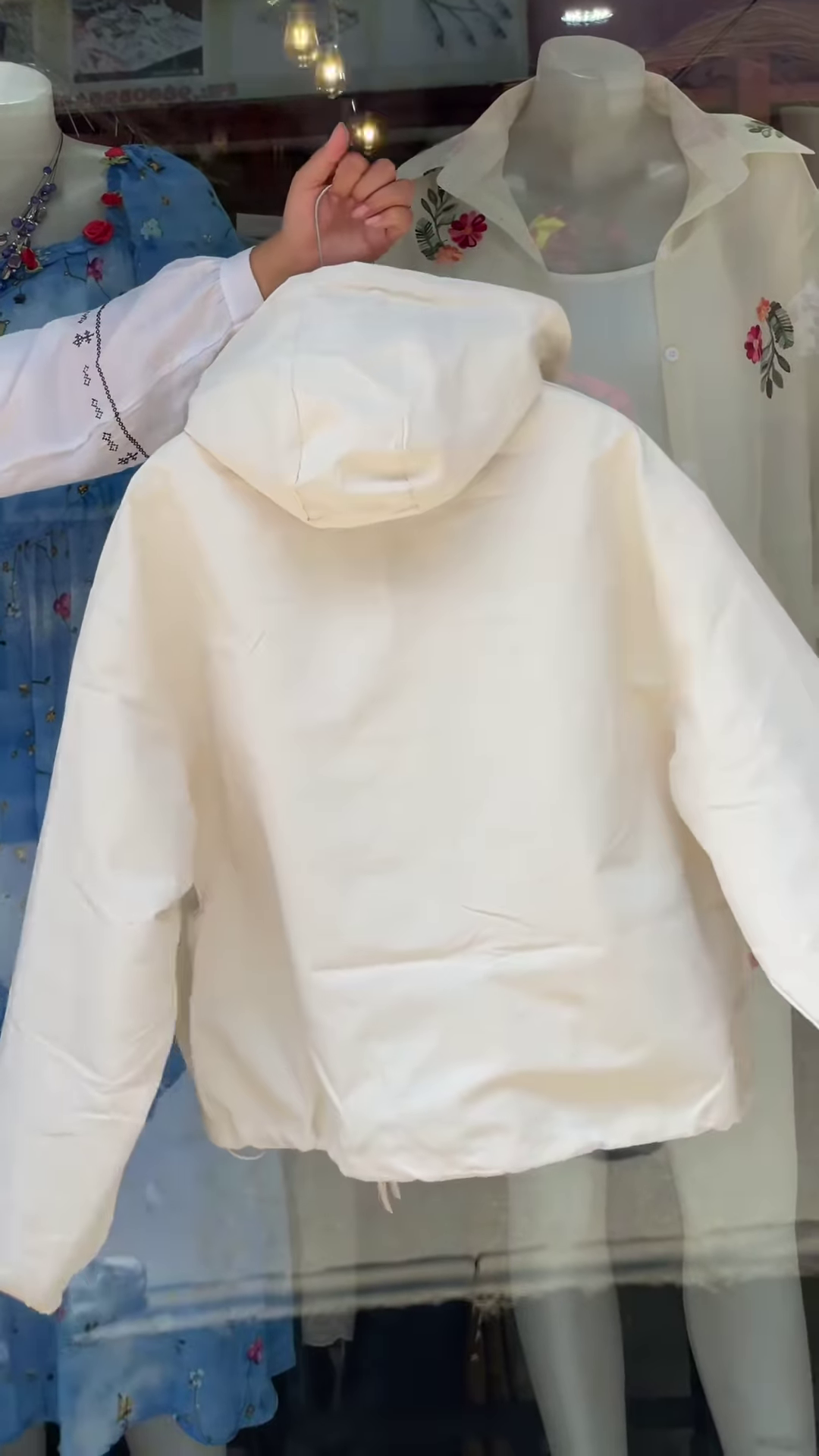 Step into boutique charm with this collection of Hooded Zip-Up Jackets, styled in a store-window setting with layered necklaces and floral-themed backdrops. Each jacket features a zip front, contrast hood lining, and clean silhouette—perfect for folded stacks, lifestyle edits, or coordinated outerwear drops. Available in Orange, White, and Purple variants. 🧥✨