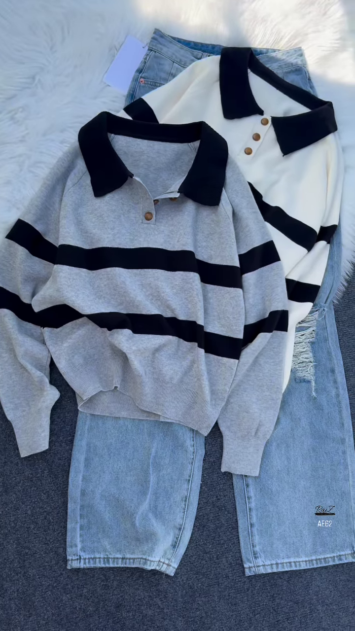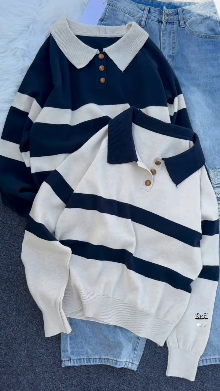 Lean into classic collegiate style with this rugby‑inspired knit, defined by bold horizontal stripes and a crisp contrast collar with a neat three‑button placket 🧶. The medium‑gauge knit feels soft yet resilient, offering breathable comfort that works solo now and layers smoothly later 🌤️. Rib trims at the cuffs and hem keep the silhouette tidy, while the relaxed drop‑shoulder cut gives effortless drape over denim, pleated minis, or tailored shorts 🔁.