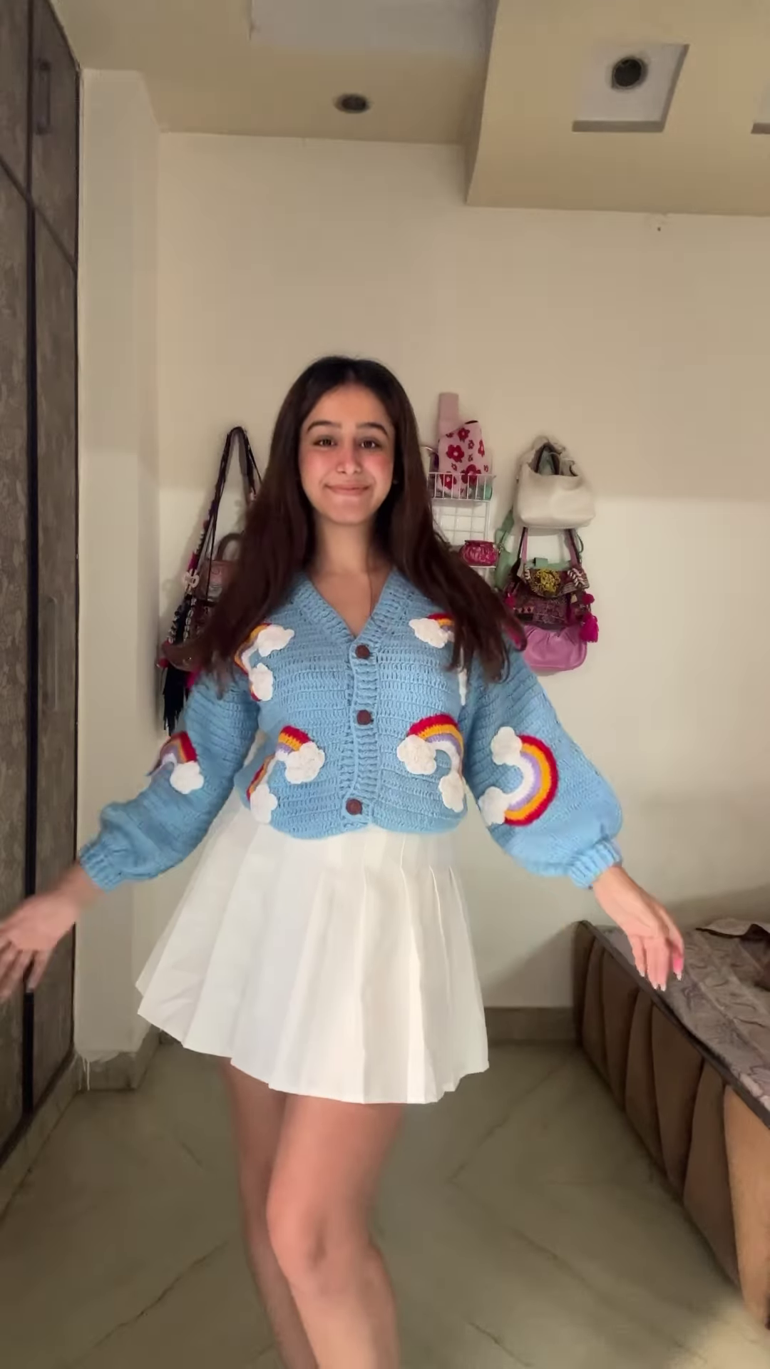 - ๐ Blue Rainbow: Light blue knit with rainbow and cloud motifs across chest and sleeves + styled with white skirt