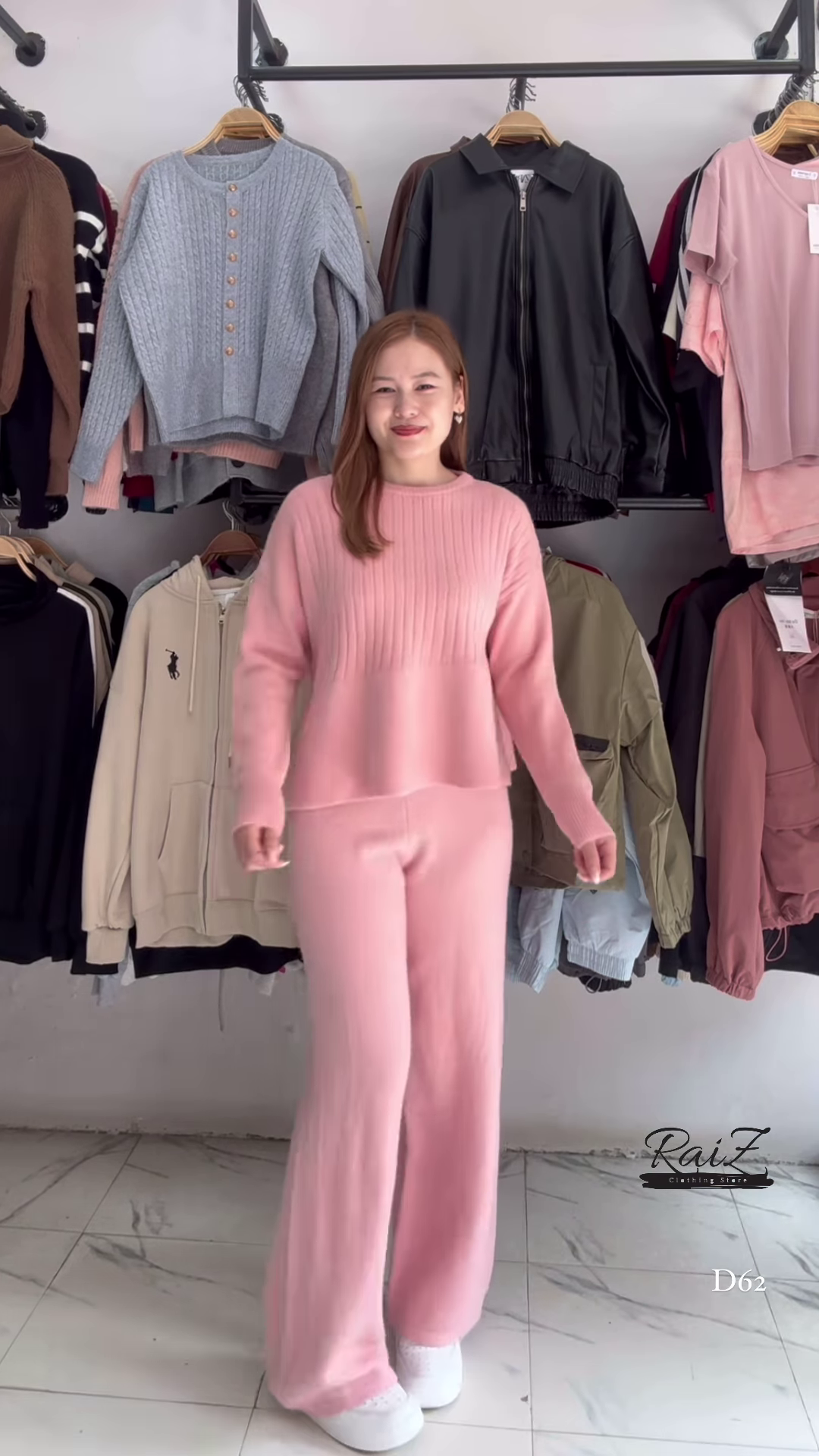 • 🟣 Light Purple: Soft pastel knit with relaxed sweater and matching pants + styled with gentle drape
