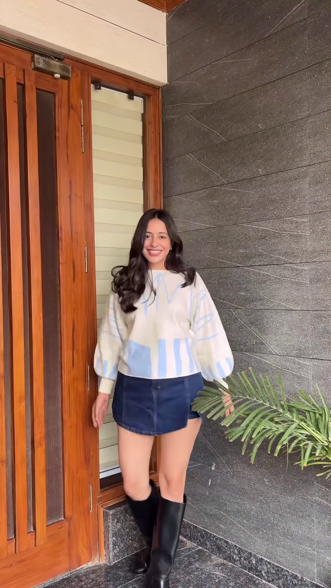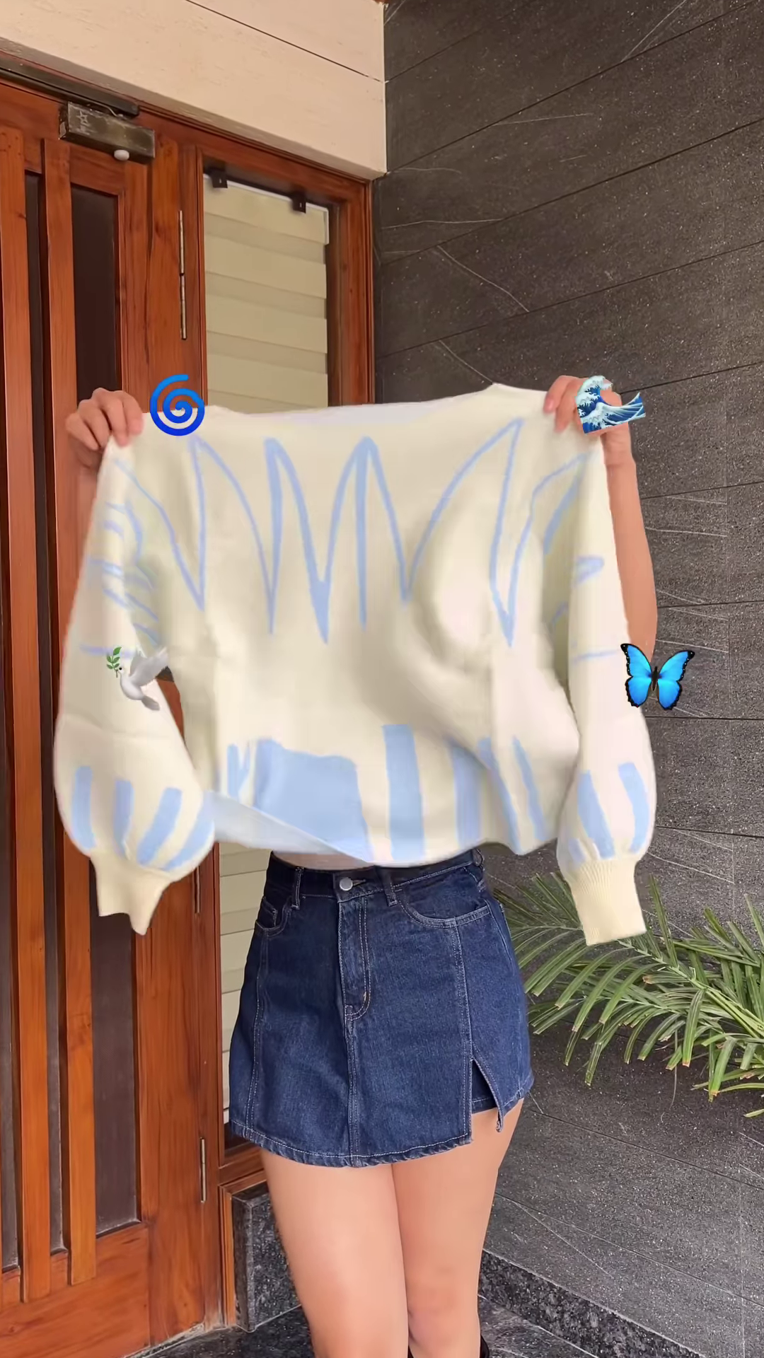 - π Abstract Cream: Cream knit with light blue abstract wave patterns + styled with denim skirt
